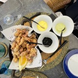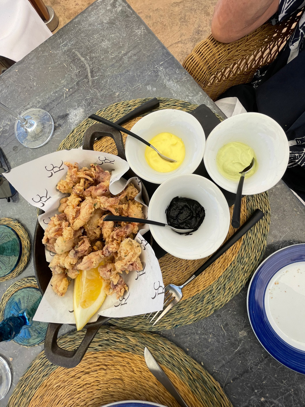 After some moreish bread and dips (2,50€ per person), we chose starters of chipirones (fried baby squids) with three flavours of aioli (23€) and salmon tartar with avocado and a curry-and-lime flavoured yogurt dressing (27€). Both were delicious and either could easily be shared between two people.