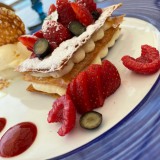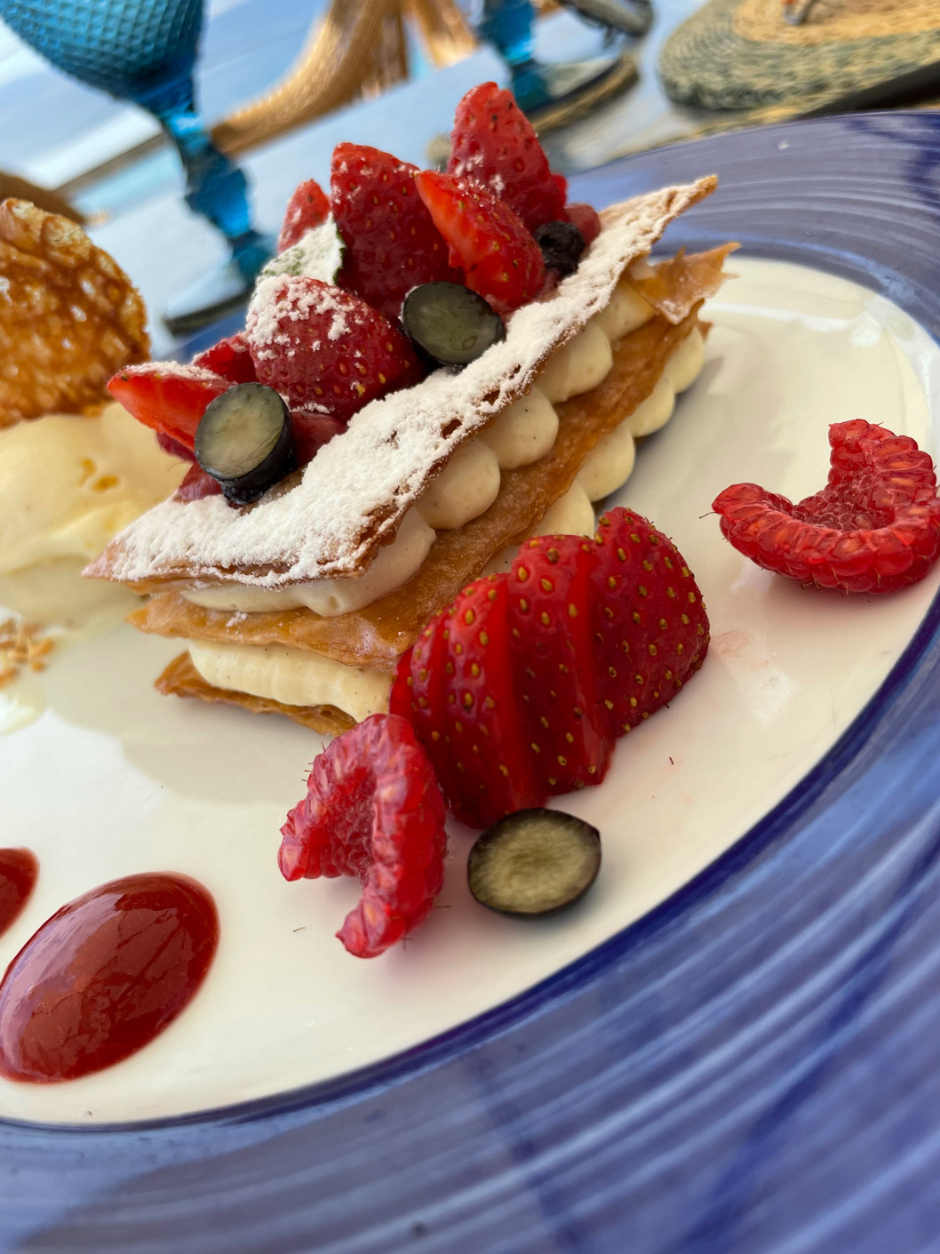 The pretty mille-feuille with fruits and mascarpone (12€) was one of my favourite desserts of recent eating-out experiences. My companion enjoyed his deconstructed cheesecake (10€).