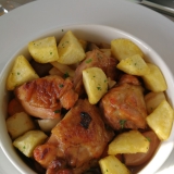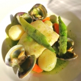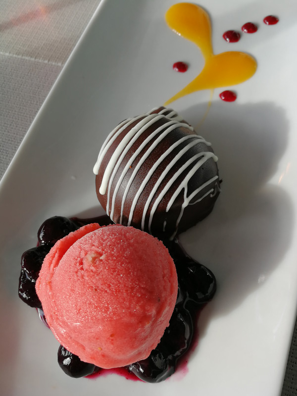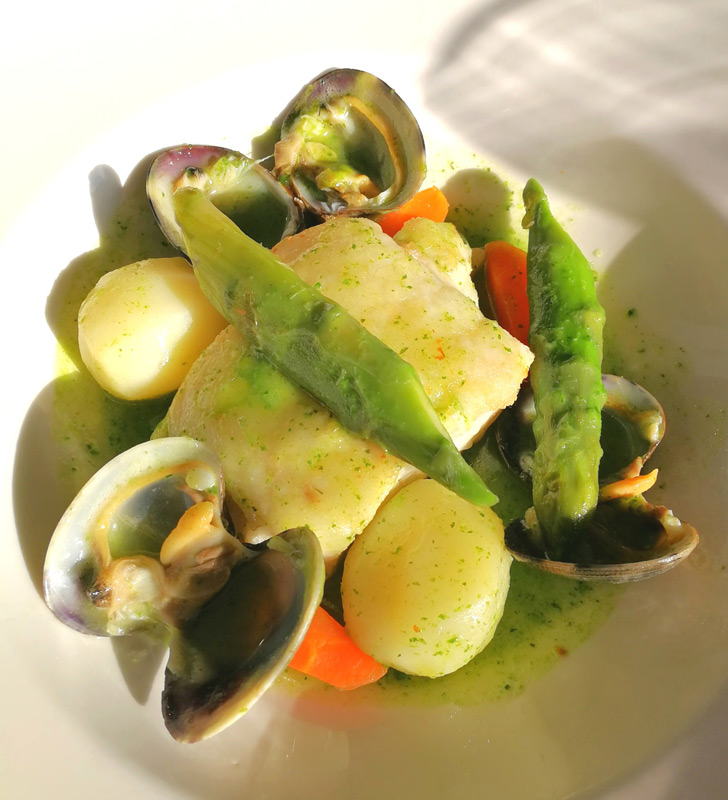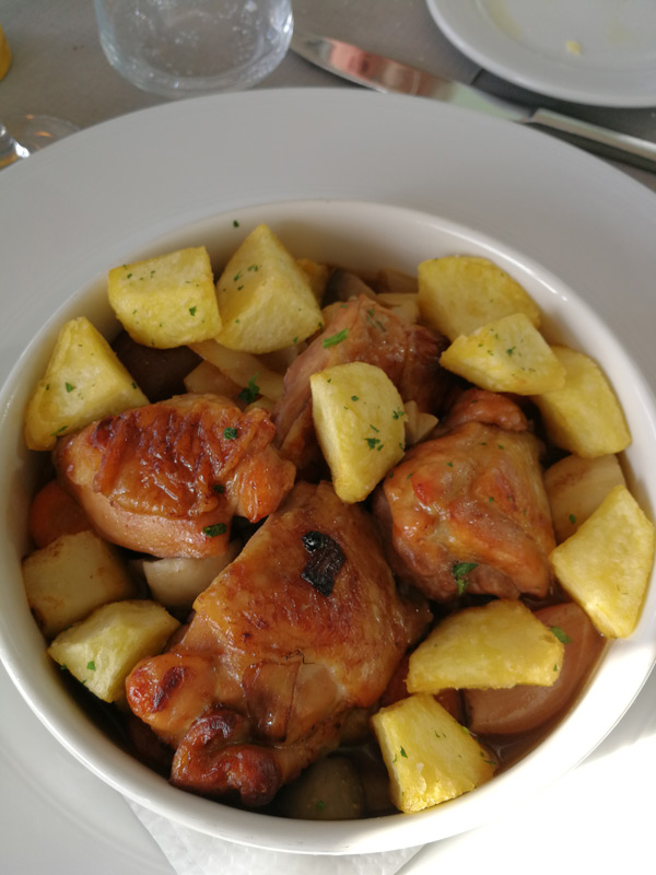 The weekly menu offers a choice of three main courses: we chose Mallorcan-style rabbit with onions, vegetables, and potatoes, and sliced, sautéed beef with mushrooms, crème fraîche, and baked potatoes. Someone in the kitchen obviously enjoys making tempura batter as it pops up on a few dishes on this mainly Mediterranean menu!