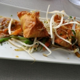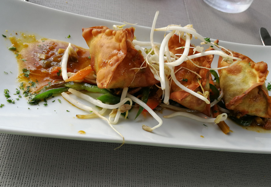 From the four starters, I chose Indonesian prawns and vegetable satay. My companion had beef carpaccio with tempura mushrooms and pesto vinaigrette.