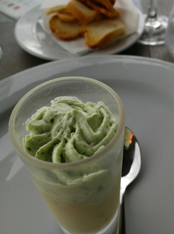 For our visit last Sunday, we had the set menu (with choices), which changes weekly and is available at lunchtime and for dinner. I think it’s excellent value for the price of 39,50 €, which has risen by less than two euros since 2019, without losing any components. Little wonder that Stay was almost full – indoors and out.
