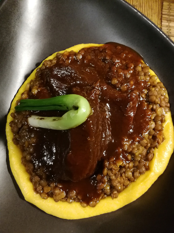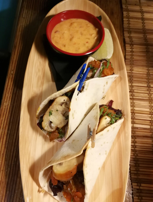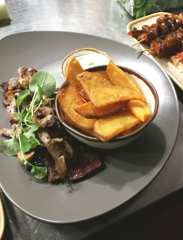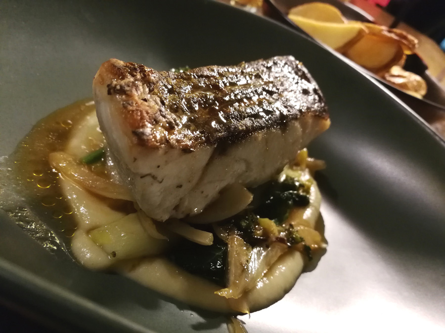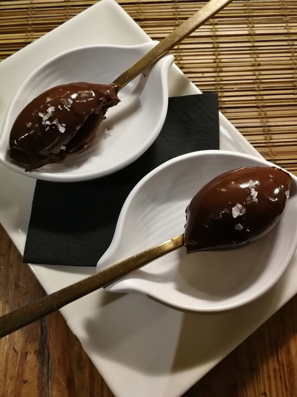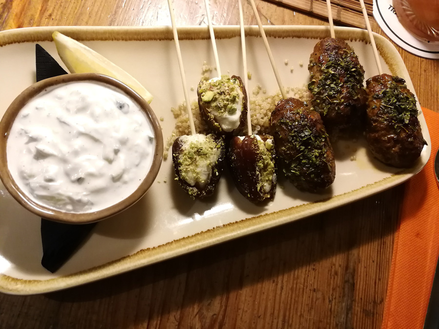 Our starters were two Indian-style vegetarian smoked carrot and fennel tacos with mango chutney and mint yogurt (7,50 €) and three Greek lamb kebabs with cucumber tzatziki and medjoul dates stuffed with goat’s cheese and pistachio (9,80 €). Our main courses were pot-roasted veal cheeks with organic Indian-style lentils, pumpkin and ginger puree and roasted spring onion, and Thai-style grilled Mallorcan sea bass fillet with wok vegetables (22 €). We also indulged in a side of recommended home-cut fries with sea salt. We ended with a small and intensely rich chocolate and olive oil truffle served on a spoon (3 €).