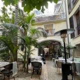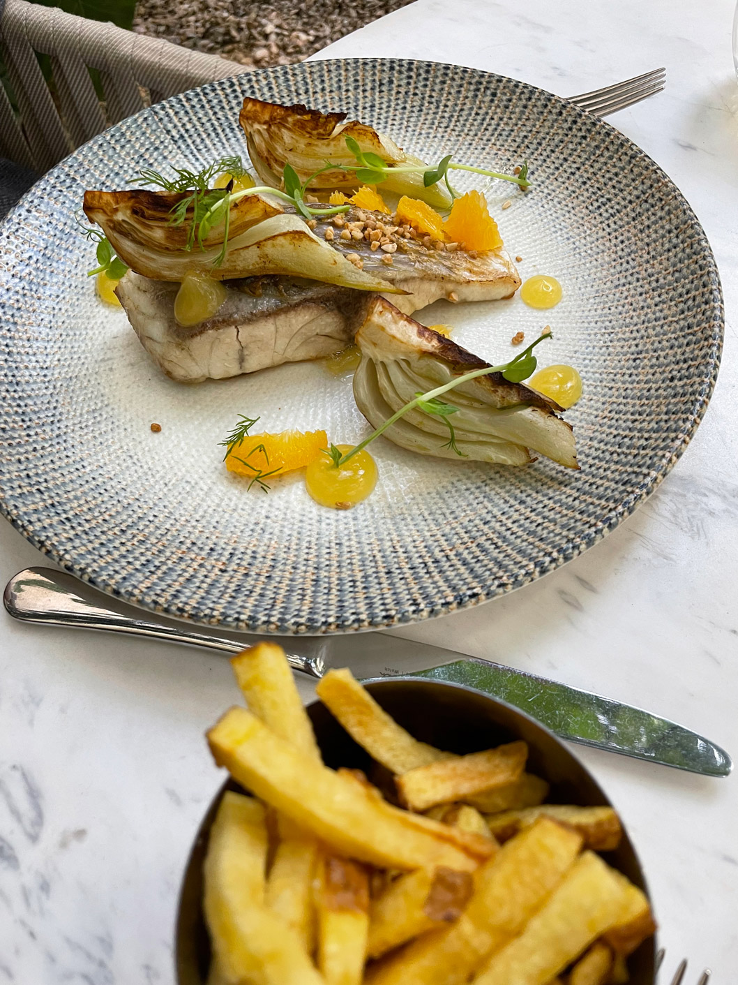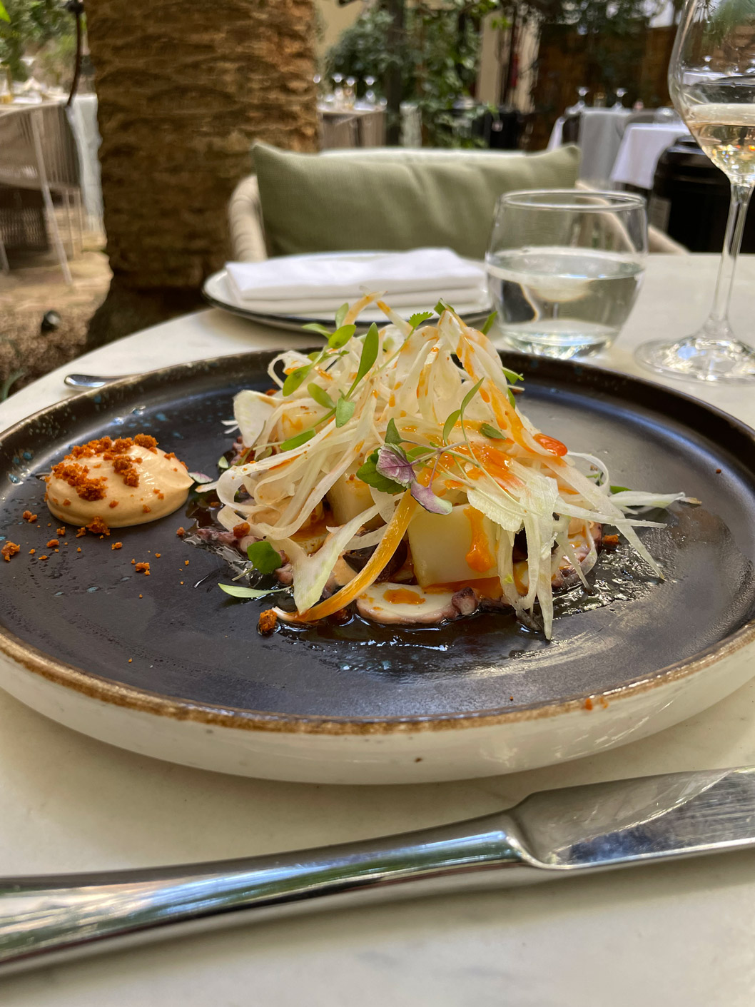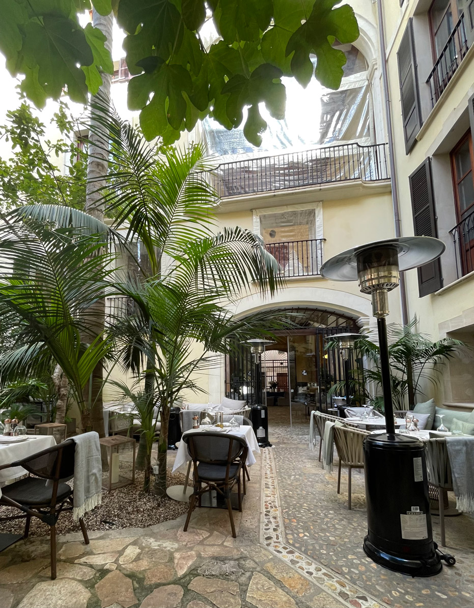 The Merchants is in the five-star Hotel Palacio Can Marqués, a magnificent 18th-century palace with a gorgeous rear courtyard, lush with vegetation. The dining room is elegant and romantic, but the opportunity to eat alfresco is always welcome, so we sat in the garden, noting the space heaters and blankets available in case of any chill. Neither was necessary that day.