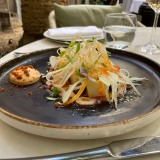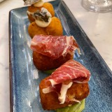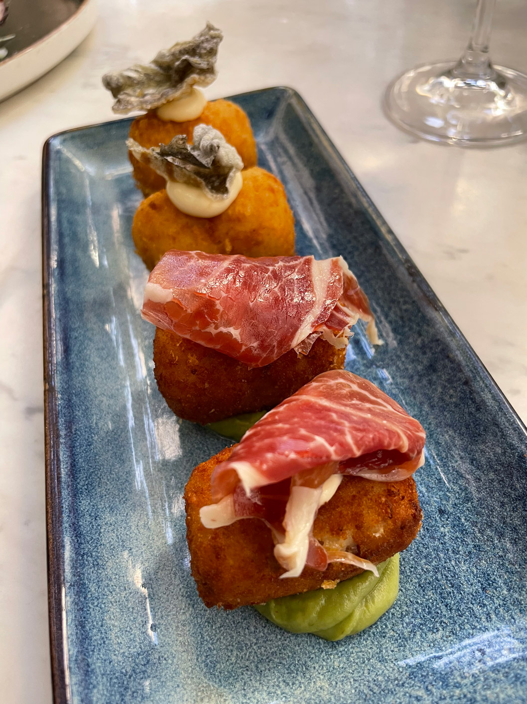 I started with the duo of croquettes and my companion chose octopus carpaccio. My starter consisted of two cod and two ham croquettes – the cod ones topped with crispy cod skin and the ham ones with pieces of ham. They made a substantial starter. My brunch companion enjoyed his octopus dish, which included sobrasada, smoked mayo, potato, and shaved fennel.