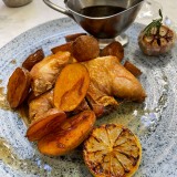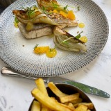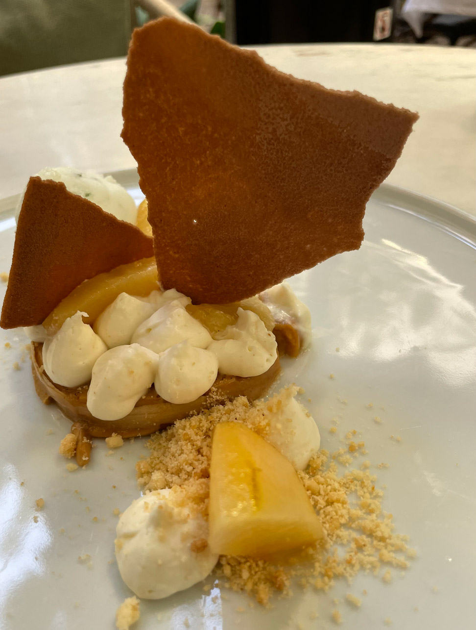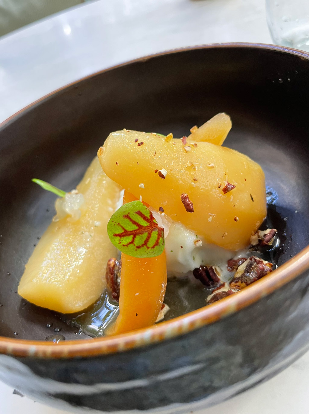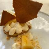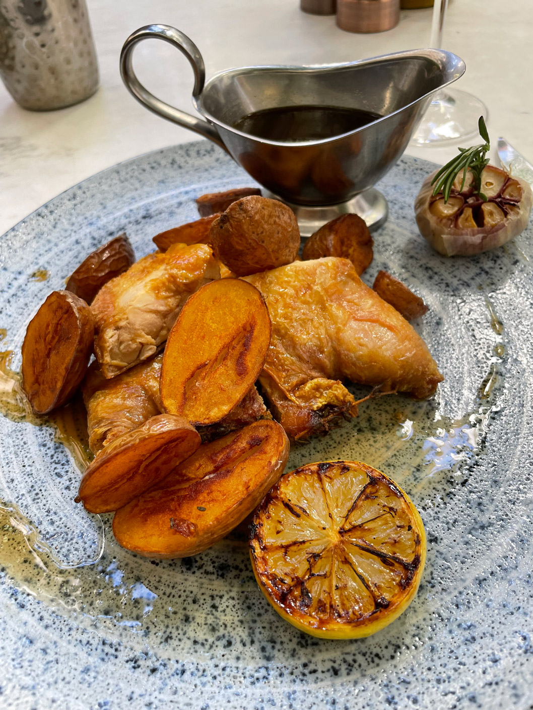 For the main course, I had a whole boneless picanton – baby chicken served with roast baby potatoes, burnt lemon, and roast garlic. The chicken was perfectly cooked, and this was a very satisfying and tasty dish, although I’d happily have swapped the garlic for a green vegetable. Across the table, my companion enjoyed the turbot catch of the day with fennel, orange, almond, and dill. He loved s’mores for dessert when he had it at The Merchants in Portals, so chose this again, while I went for a vegan dish of pear with caramelized nut, and thyme.