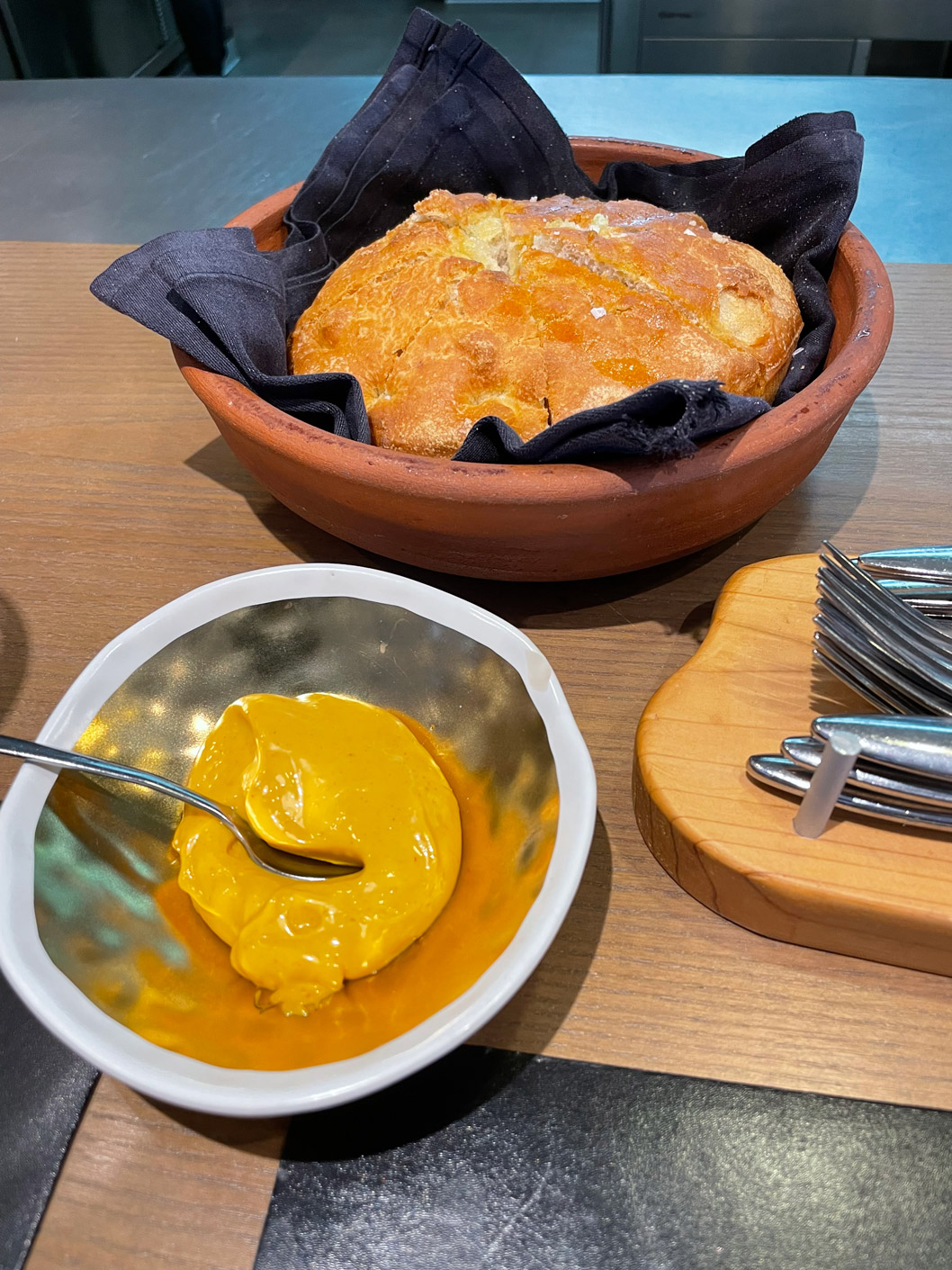 Of the three tasting menus – Caldentey (5 plates), Soler (8 plates), and Tomeu (10 plates) –. we’d booked the Soler menu at 49€, noting that the prices hadn’t changed since 2020. Drinks aren’t included and Tomeu’s moreish olive oil bread and spicy spread add 2,50€ per person to the bill – worth every ‘céntimo’ though. There’s no printed menu so every plate is a surprise.