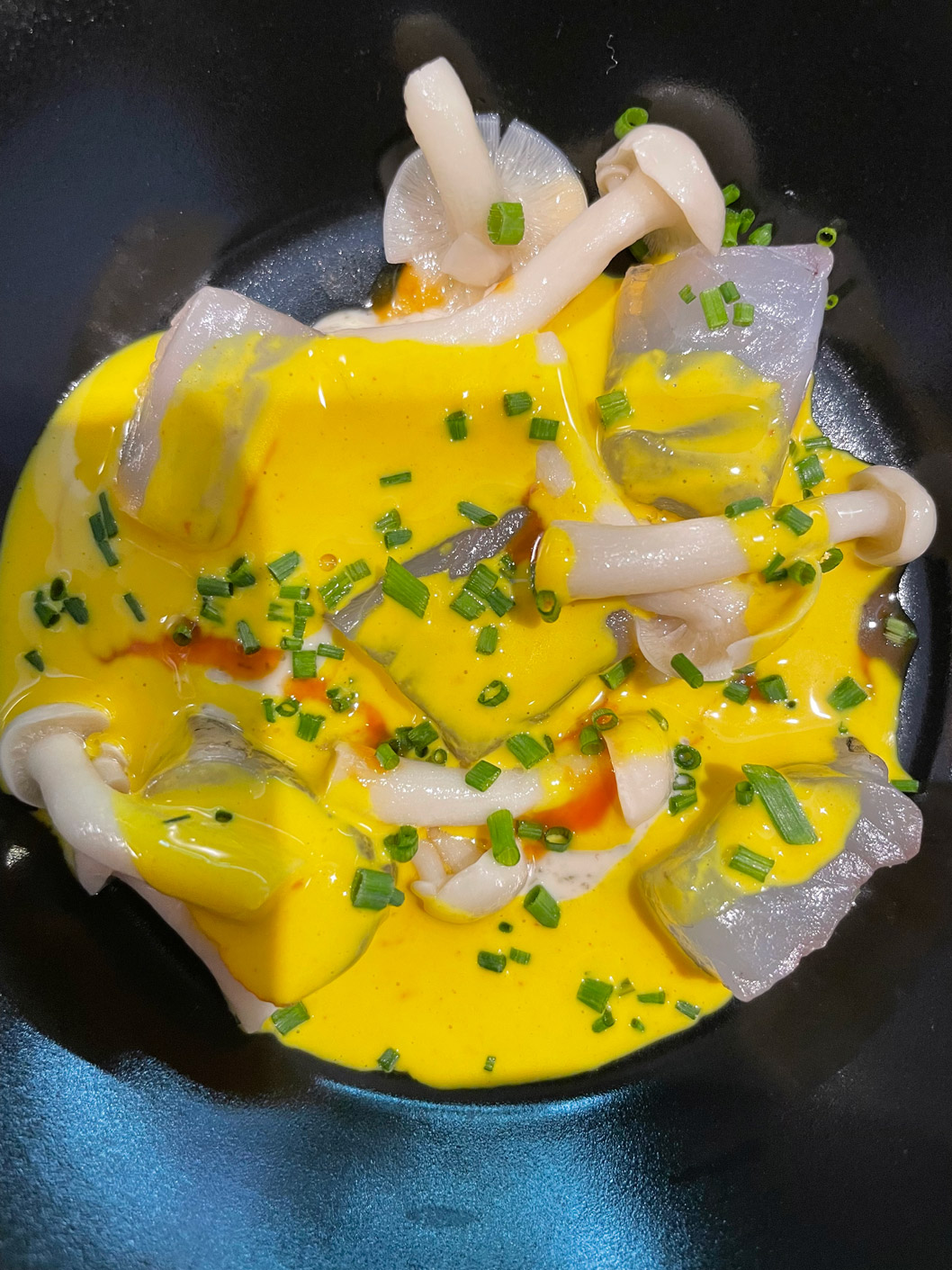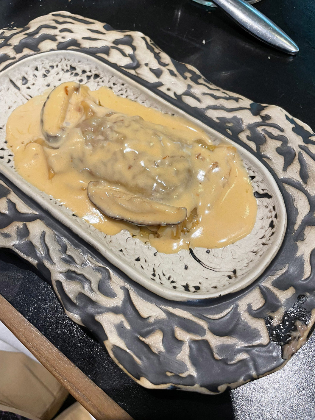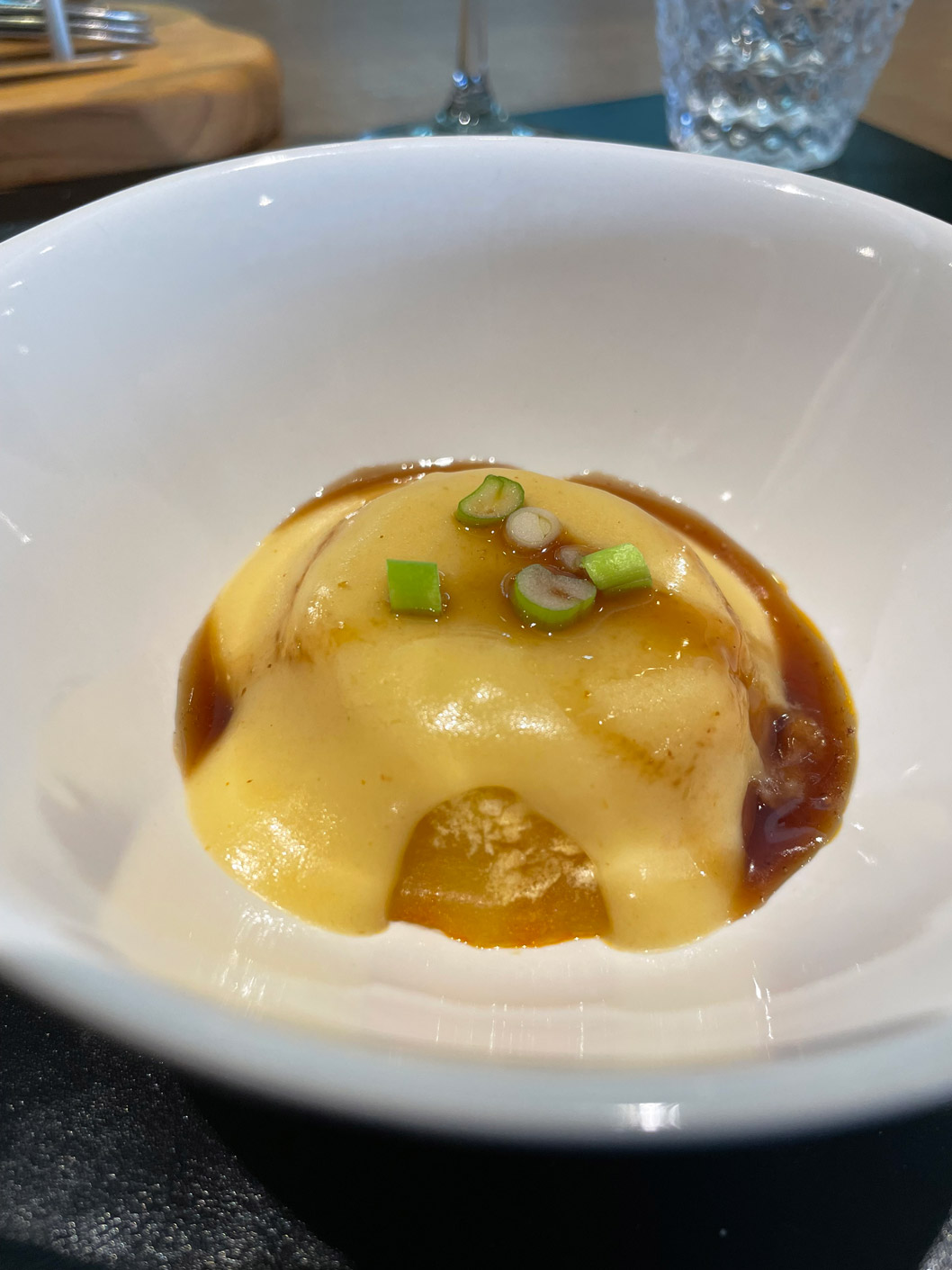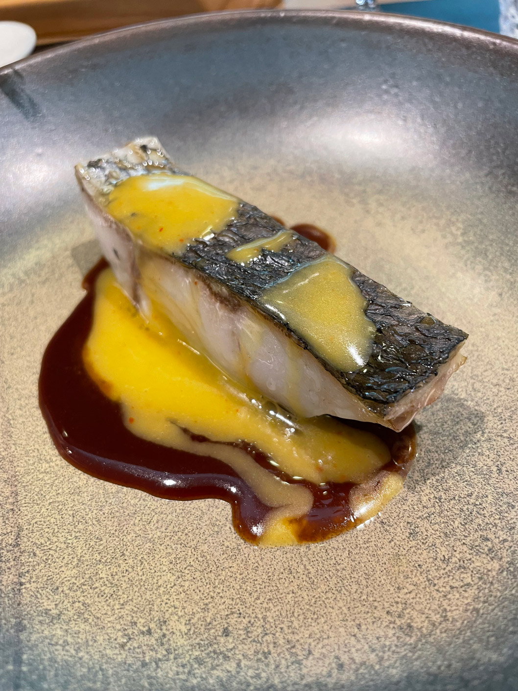 Our first was sea bass with shimeji mushrooms in a curcumin sauce – vibrant in both flavour and appearance. This was followed by perfectly cooked cod with gratinated mushrooms, wasabi, and garlic aioli. This dish looked so tempting, I’d almost finished eating it when I realised I hadn’t taken a photograph.