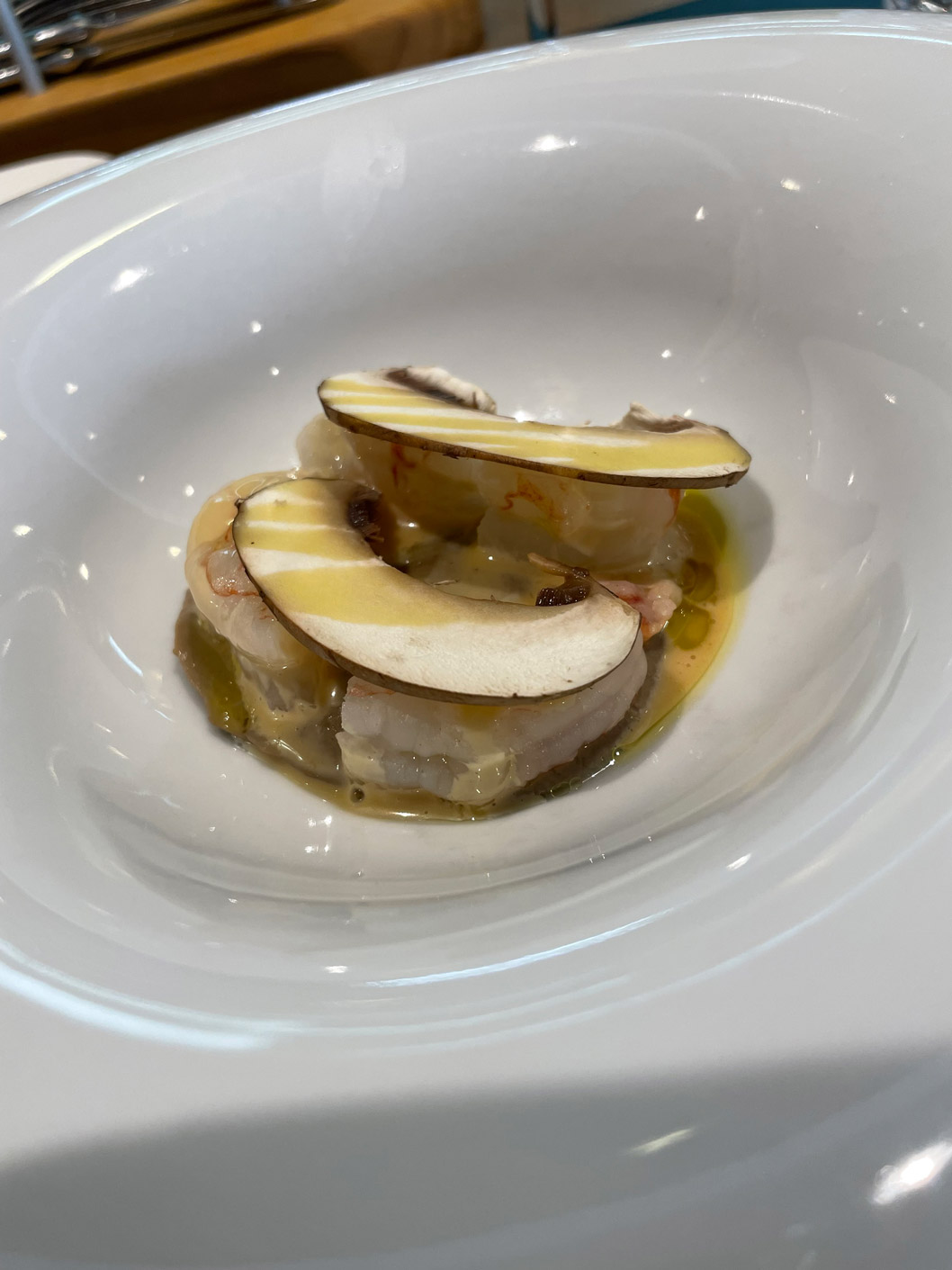 The seafood theme continued with the third plate: an umami-rich cream of mushrooms with prawns and white miso. Baked apple was at the heart of the next dish, which also had a touch of curry, small pieces of sobrasada, and a foam of apple juice. Then we were back to fish – an unusual but tasty combination of corvina served with red pepper and cacao with a kimchi and orange sauce.