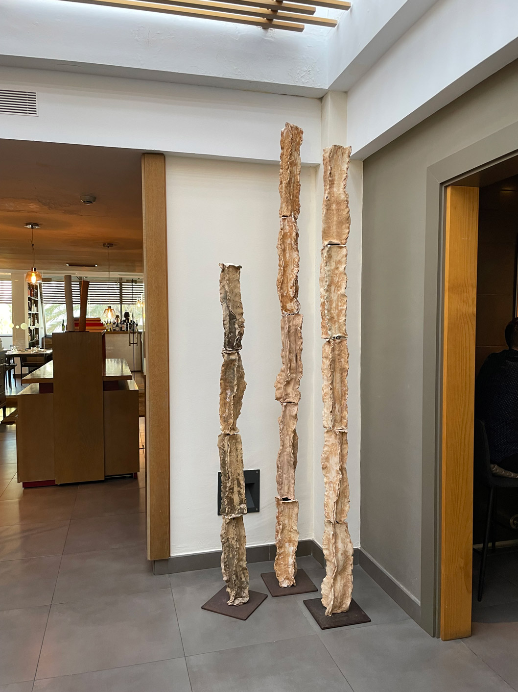 The restaurant itself is modern, light, and decorated with contemporary art. But our eyes were fixed on what was happening in the large, well-equipped kitchen where this Mallorcan chef used to lead a brigade of chefs creating Michelin-starred cuisine at his former restaurant Bou. The prime seats are comfortable, high chairs at the two counters, and offer a ringside view of the culinary action. We sat alongside two other local couples at one counter. A few diners sat at conventional tables.