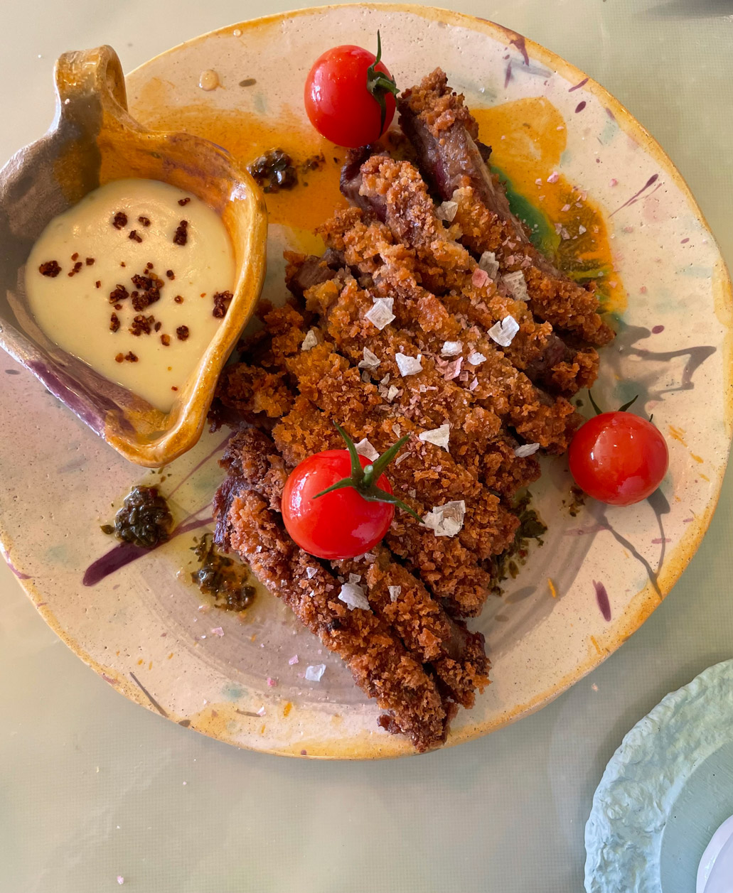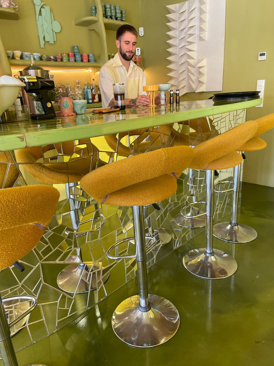 On entering Trobar, the colourful décor strikes you: the walls and ceiling of the light-filled dining area are painted what I’d call avocado-flesh green. Quirky and brightly coloured tableware is on every table, and the cutlery and wine and water glasses are unlike any I’ve seen before.