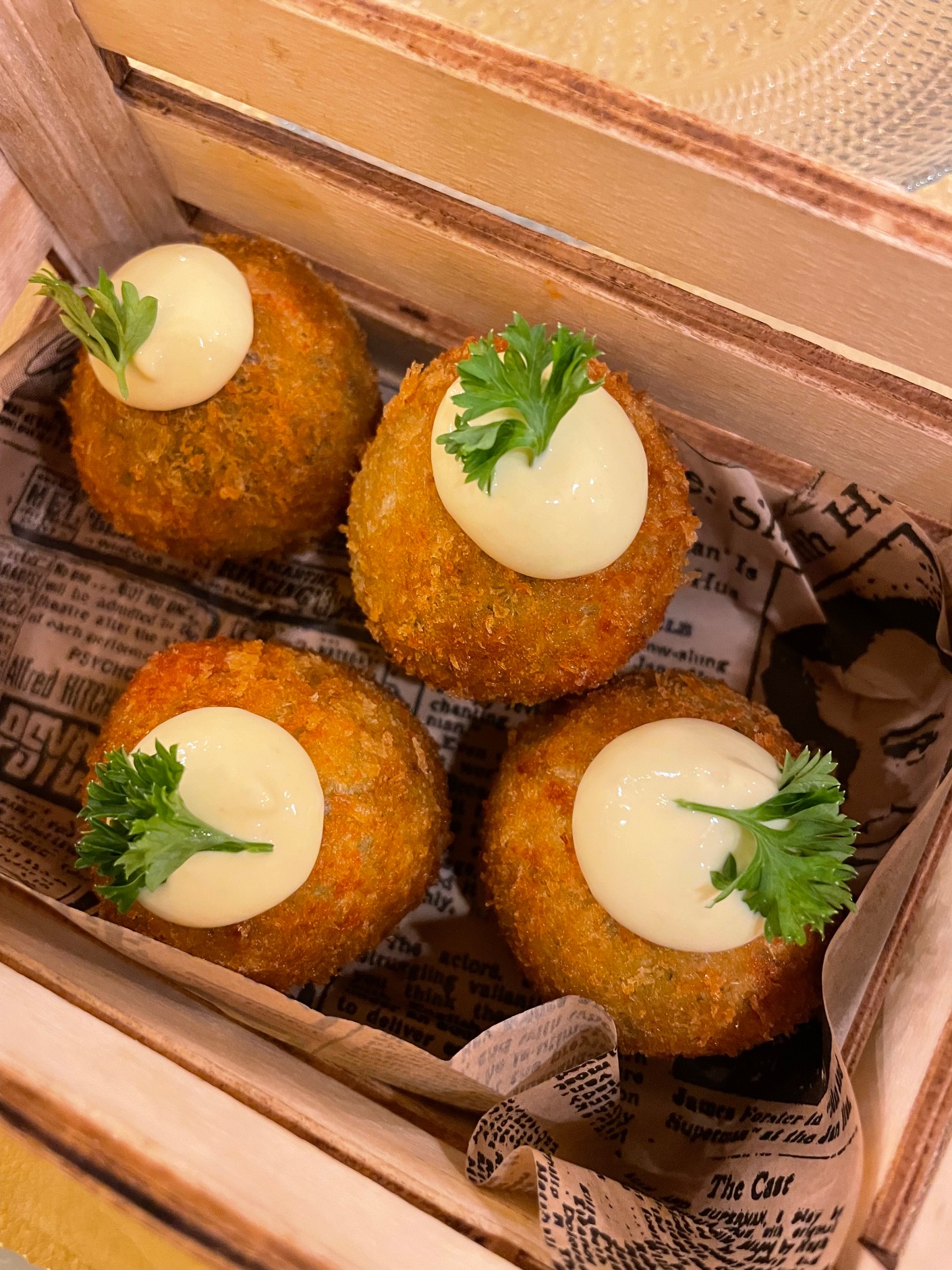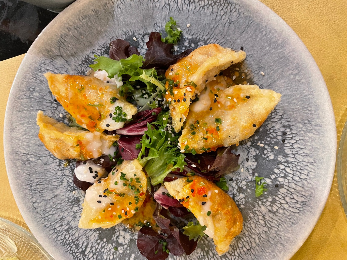 The menu is divided into starters, tacos, woks, meat, fish, and side dishes. We always have trouble choosing from the nine starters, as they’re all tempting. My personal favourites include the scallops with Thai curry sauce (14,50€), but for our latest visit, we chose the six chicken gyozas (11,25€) and Übeck’s unmissable croquetas – to which I am slightly addicted. (12,50€). They’re flavour bombs made from roast chicken, spinach, peanuts, and curry.