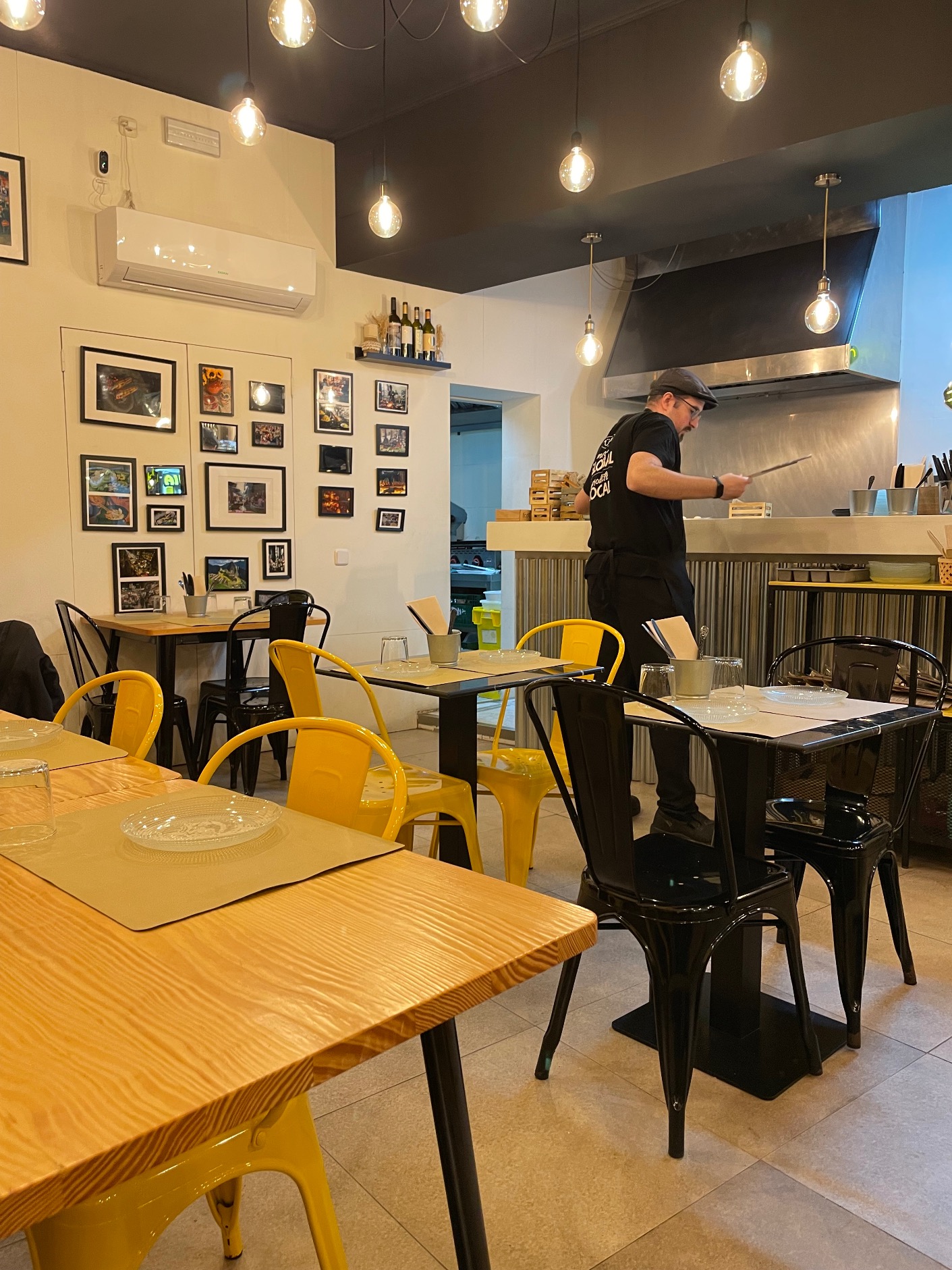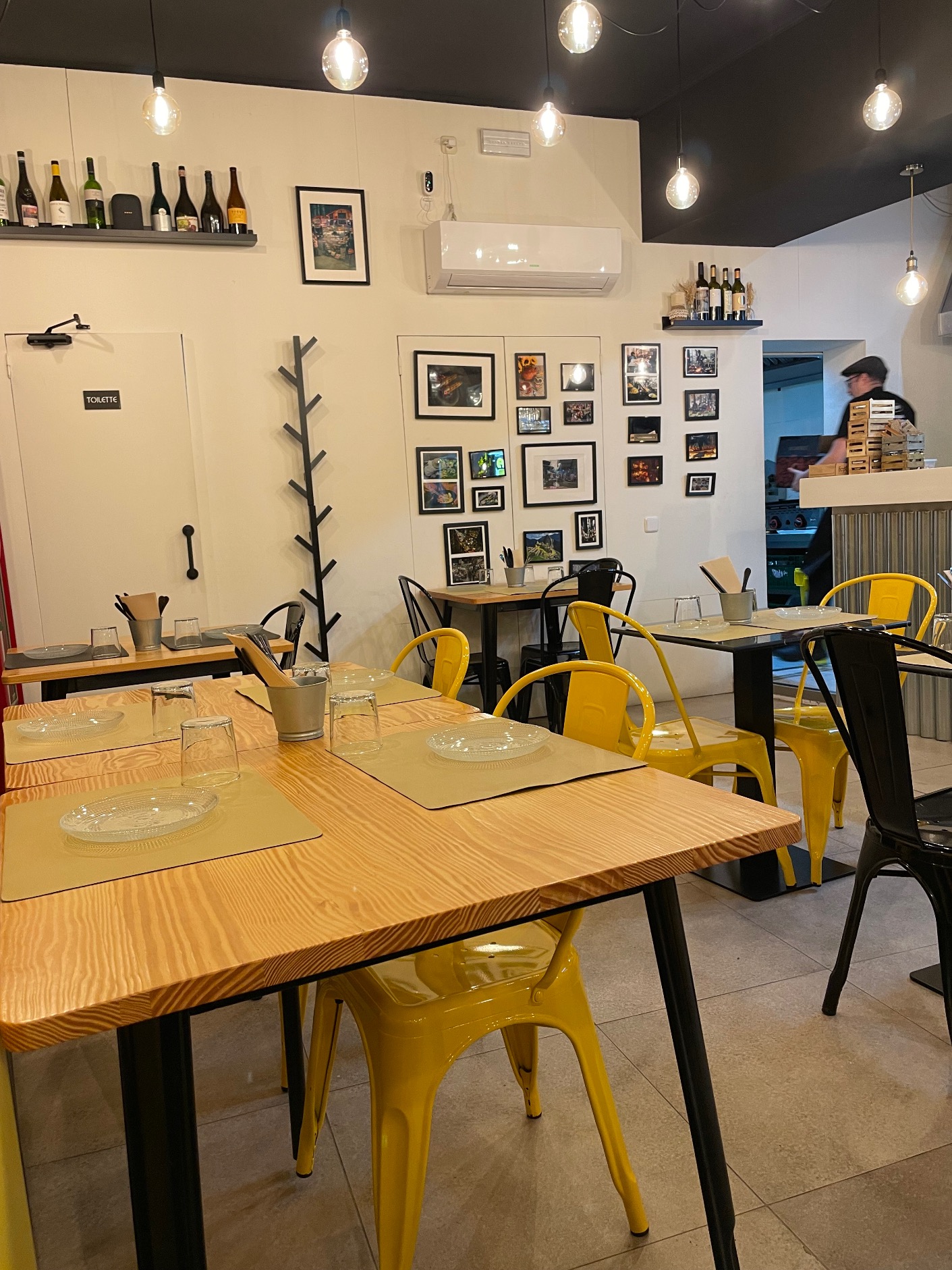 The restaurant is small, with table seating for around 24 diners, and a counter behind which is the bar and the food-plating area. The interior is contemporary, clean, and bright, with black and yellow as the main décor colours. The informal ambience is ideal for a lunch out or food with friends in the evening.