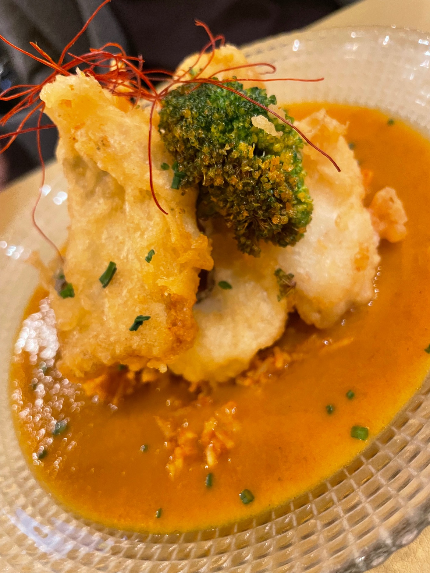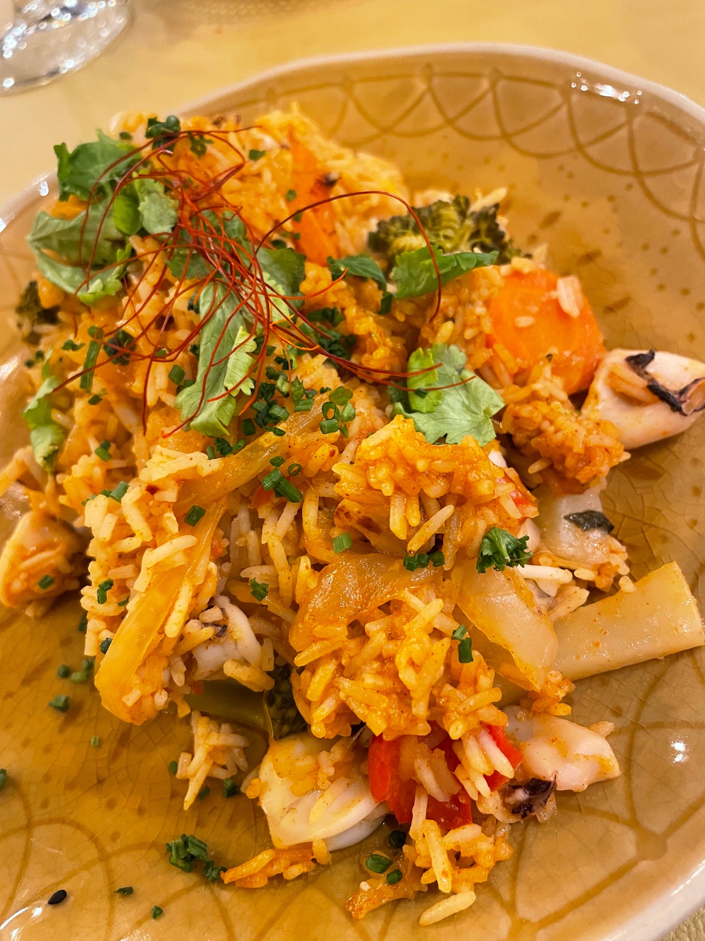 For mains, my husband chose cod in tempura with a curry sauce, basmati rice, fried broccoli, and curry mayonnaise (16€), and I had a generous portion of squid with Korean basmati rice and vegetables (16,25€).