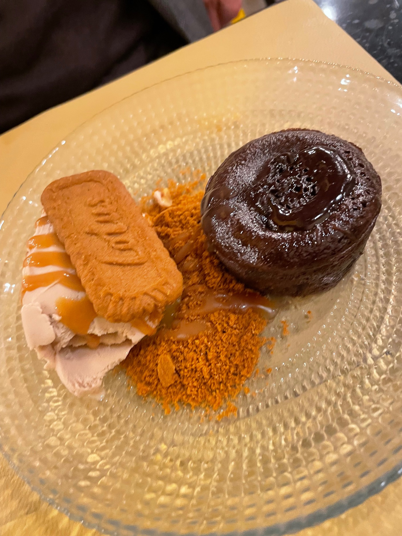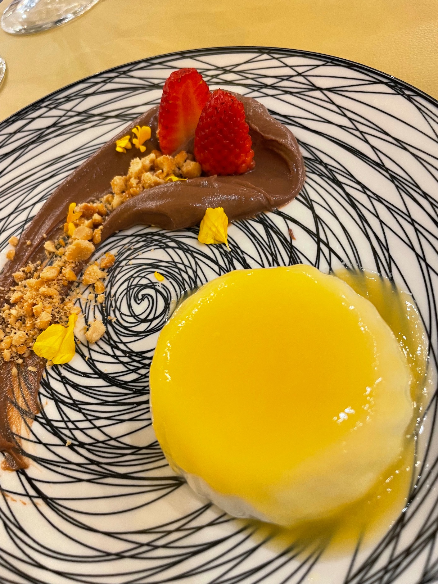 The menu offers four desserts (priced 6€-7€). My husband chose ice cream with mini coulant, ‘Lotus’ cookie, and toffee, and I had a silky coconut-milk pannacotta draped with passion fruit coulis, with chocolate ganache and caramelized peanuts.