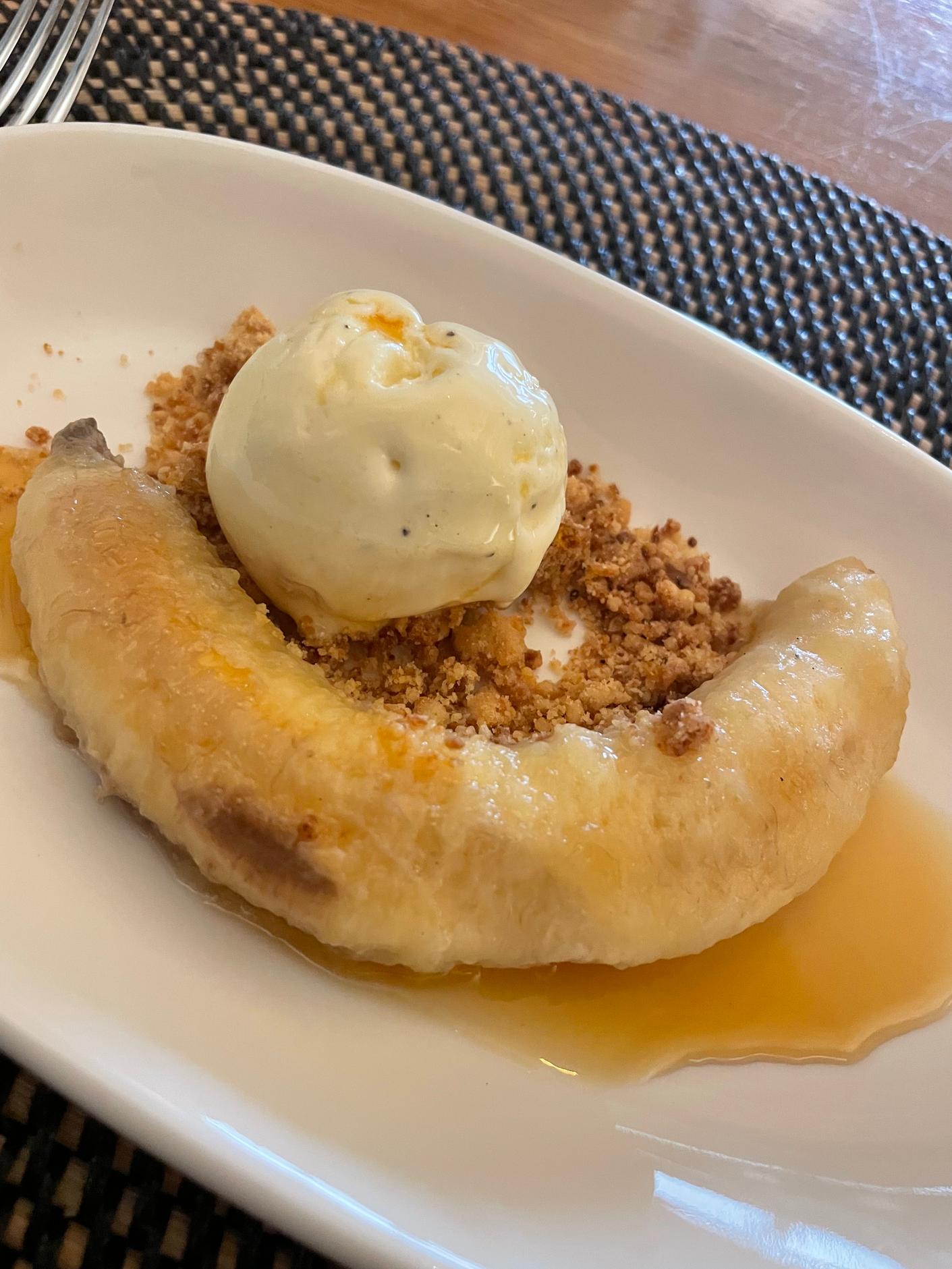 We had the choice of three desserts: grilled banana with maple syrup, a butter-biscuit crumb, and vanilla ice cream; almond cake with vanilla ice cream, or seasonal fruit. Two of us enjoyed the banana dessert, the other had almond cake.